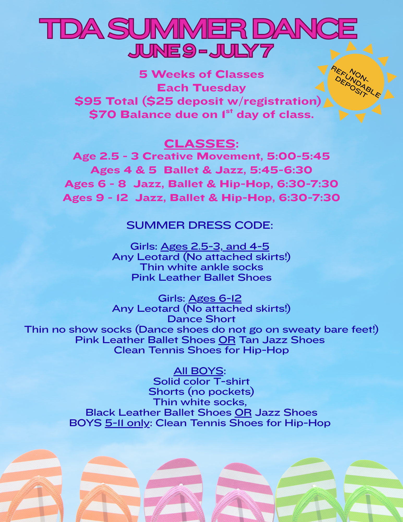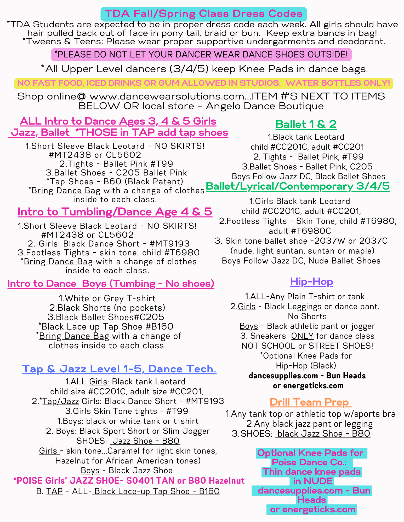 Please keep extra hair elastics and brush in dance bags. Hair elastics are available for purchase in TDA office.